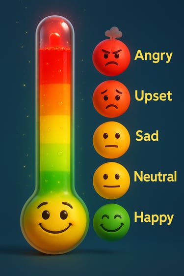 This emotional thermometer helps children recognize and express their feelings using clear colors and simple expressive faces. The scale moves from red (strong emotions) to green (positive emotions), with six easy‑to‑identify states: Angry, Upset, Sad, Neutral, Happy, and Very Happy.