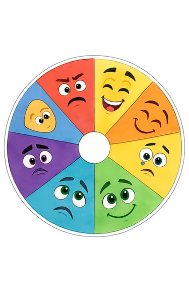 This emotion wheel helps children identify and express their feelings using simple, expressive faces arranged in a clear circular layout. Each segment represents a different emotion, making it easy for children of all ages to point, choose, or talk about how they feel.